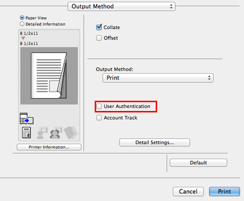 In the [Output Method] window, select the [User Authentication] check box (and the [Account Track] check box).