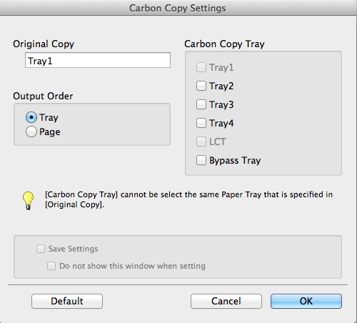 [Save Settings] | When the Save Setting check box is selected, the settings are saved. When the [Do not show this window when setting] check box is selected, this dialog box is not displayed when [Carbon Copy] is enabled. Using this function, you can save steps to configure settings the next time and after if you always specify the same carbon copy tray settings to execute a print job. |