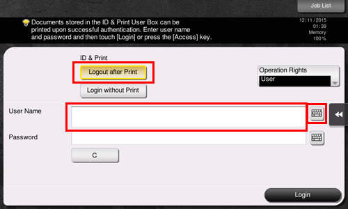 When you are successfully authenticated, all data items saved in the ID & Print User Box are printed.