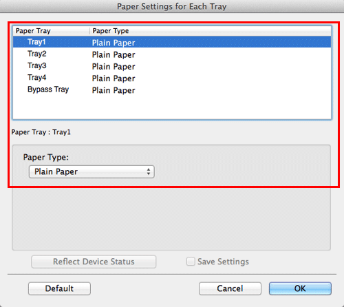 In [Paper Settings for Each Tray...], you can set a paper type for each tray. When you specify anything other than [Auto] in [Paper Tray:], the paper type information specified here is applied.