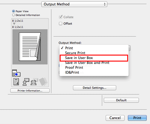 In [Output Method:] in the [Output Method] window, select [Save in User Box].