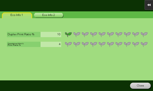 Tapping [Eco Info] allows you to check the ratio of paper saved as a result of utilizing two-sided printing or the page combine function, and the accumulated time during operations or power saved as a result of the user's operation methods.