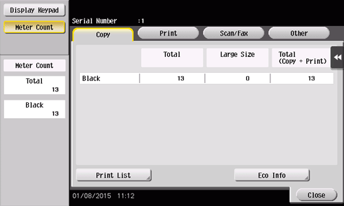 The counter indicates the total number of pages printed on this machine on a function basis. Check counter information on the Control Panel of this machine. When necessary, counter information can be printed in list form.