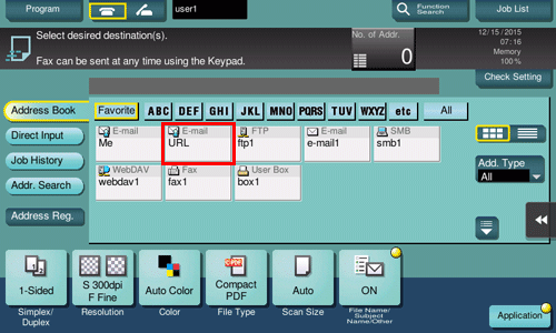 If you select the [URL] key displayed on the [Address Book] screen, you can send the URL to download the original data scanned on this machine, to your E-mail address by E-mail. When you log in to this machine that provides user authentication, the [URL] key appears on the [Address Book] screen. The [URL] key has the login user's E-mail address registered. The scanned original data is saved in a User Box on this machine without being attached to an E-mail during the pre-specified period, so data can be acquired regardless of the transmission capacity limit of the E-mail server.