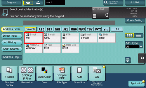 By selecting the [Me] key displayed in the [Address Book] screen, you can send E-mails to your E-mail address. If you log in to this machine that provides user authentication, the [Me] key appears in the [Address Book] screen. The [Me] key is assigned to an E-mail address of the login user. To use this function, you do not have to register your E-mail address in the address book.
