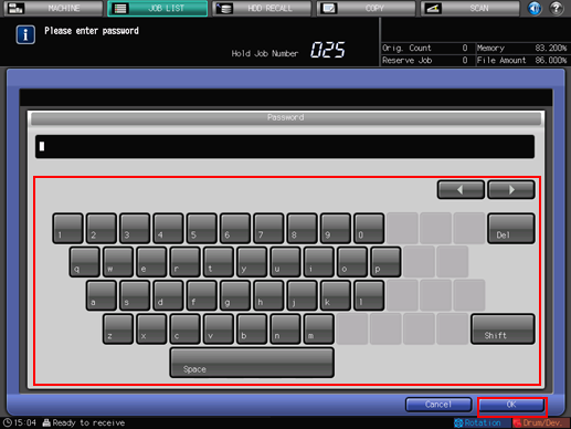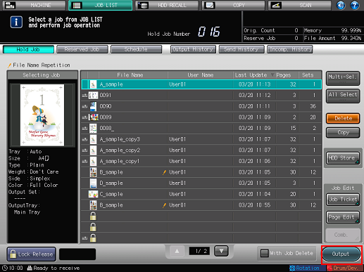 For details about job editing functions on the [JOB LIST] screen, such as Save in Hard Disk, refer to Editing Hold Job.