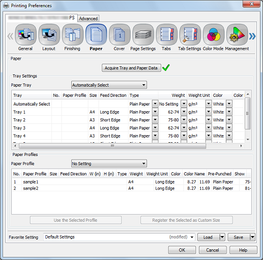 [Acquire Tray and Paper Data] | - | Acquire the paper tray information set and the paper profile information defined in this machine.