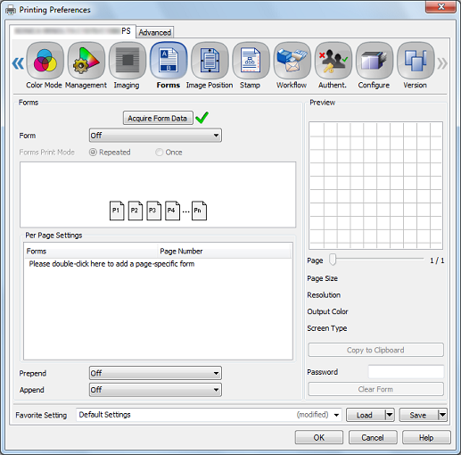 [Forms Print Mode] | [Repeated], [Once] | Select [Repeated] to overlay all form pages repeatedly in order from the first page on a printing document. Select [Once] to overlay all forms pages only once in order from the first page on a printing document. |