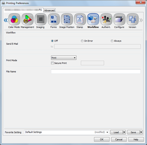 [Print Mode] | [Print], [Spool], [Hold], [Print and Hold], [Form] | Set a print method. When [Normal Print] is selected, the print job is printed without it being saved in an HDD. When [Spool] is selected, the print job is saved in the HDD in the machine temporarily, and then printed. It can prevent the intermittent printing that may be observed when printing jobs with a lot of pictures, etc. If you select [Form], you can save an image file to the image controller and use it as a background from the [Form] tab for this driver. For details about [Form], refer to Forms. For details about [Save] and [Save/Print], refer to Saving a Print Job to HDD (PS Plug-in Driver). |