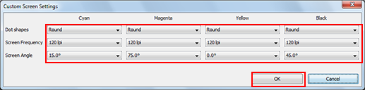 For each color, select the Dot shapes, Screen Frequency, and Screen angle, and click [OK].