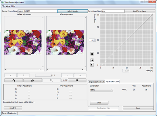 (CMYK values view area) | Displays CMYK values of the cursor position when the mouse cursor is on the image of either Before Adjustment or After Adjustment. |