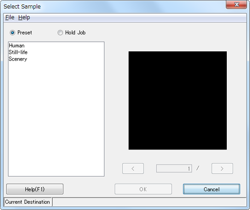 (list) | According to the selection of [Preset]/[Hold Job], displays a list of preset images or a list of hold jobs (file name and registration date/time) in the image controller which is connected currently. Secure Print jobs are not displayed. |