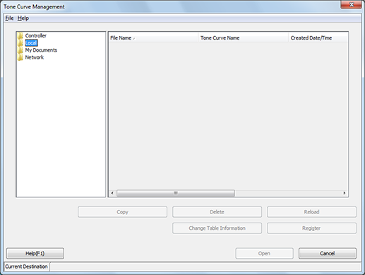[Export]/[Register] | Exports a tone curve that you select on the list to [Local], [My Documents], or [Network], when [Controller] is selected on the tree view. Registers the tone curve selected on the list to [Controller], when a folder other than [Controller] is selected on the tree view. |