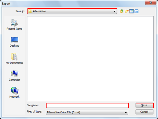 From the [File] menu on the [Alternative Color Management] screen, select [Export].