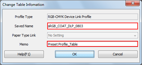 But, you cannot change the table name of the RGB-CMYK device link profile which was registered at factory shipping.