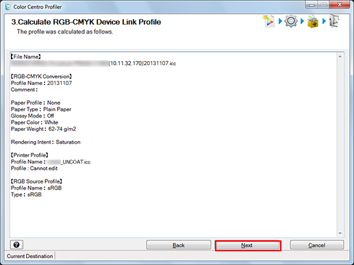 On the Calculation Result screen, displays the list of the setting of the generated RGB-CMYK device link profile.
