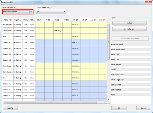 To set a profile set as paper type default, select a profile set and click [Set as Paper Type Default].
