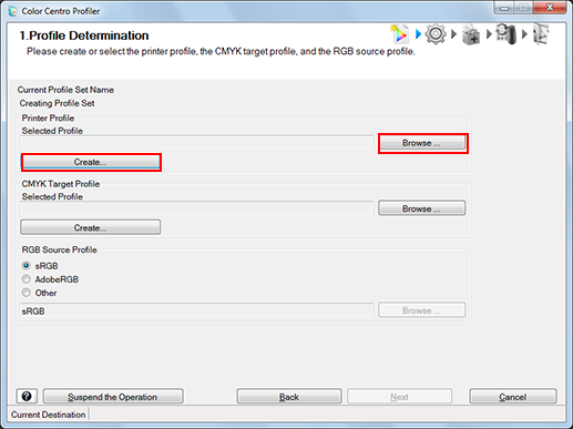 On the Profile Determination screen, specify the printer profile, the CMYK target profile and the RGB source profile which are used by Profile Set. In addition, you can create the printer profile and the CMYK target profile as required.