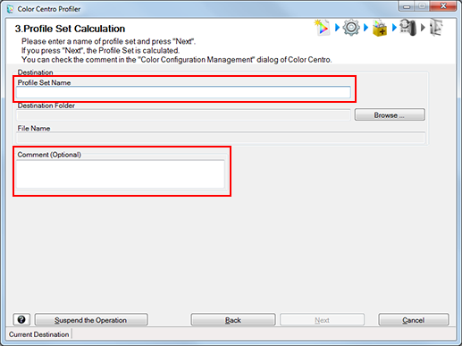 Enter a profile set name and comment. In the Comment, enter as required a comment to be embedded into the profile set you create. You can confirm the comment when you select the Profile Set on Color Centro Profiler.