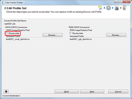 On the Recalculate Profile Set screen, you can set to recalculate Profile Set and replace the device link profiles.
