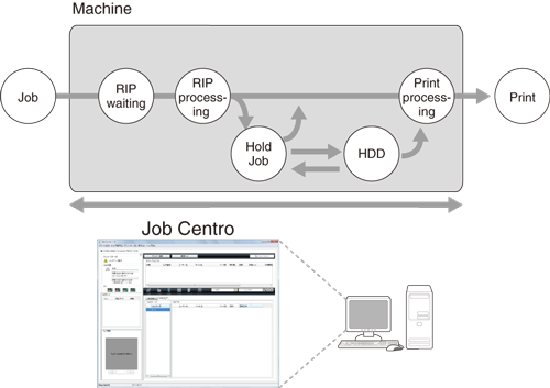 The monitoring range of Job Centro is so wide that you can monitor from receiving of job data in the image controller to outputting of job and also you can check the active job, the hold jobs, and the HDD jobs. Using Job Centro, you can also operate these jobs being within the range mentioned above. In addition, you can use the job editing and the page editing functions of Job Centro to edit jobs in the Hold queue of the machine.