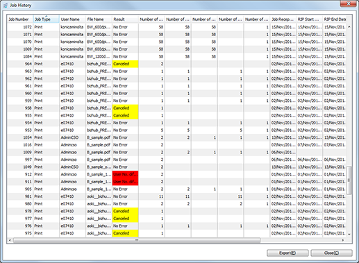 You can display the [Job History] screen by clicking the [Job History] in the [Job Centro] screen. The job history can be saved in a file in the CSV format (the administrator only).