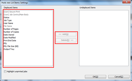 When you select [Highlight unprinted jobs], the jobs listed as "Unprinted" under [Print End Date] will be highlighted in the Hold Job list and the HDD Job list.