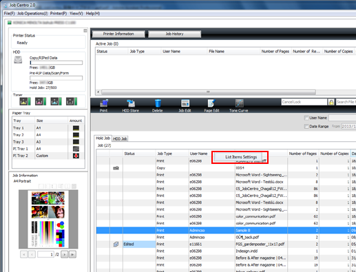 You can set items to be displayed in the Active Job list, the Hold Job list, the HDD Job list, and the [Job History] screen.