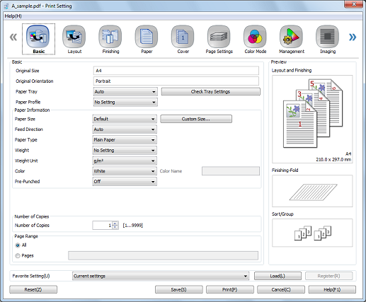 Tab (icon) | The items for print setting are divided into multiple setting screens. Selecting the tab (icon) in the upper part of the screen displays the corresponding setting screen at the bottom of the screen. The types of setting screens are as follows: