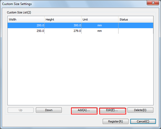 On the [Custom Size Settings] screen, select [Add] or a Custom Size from the list, and click [Edit].