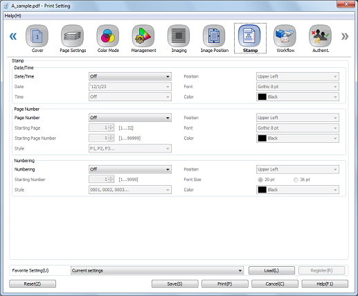 The setting items here are the same as those of the "Stamp" screen of the PS Plug-in driver. For the description of the setting items, refer to Stamp.