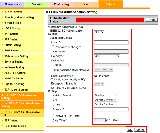 [Client Certificates] | Specifies whether to encrypt the authentication information by using the device certificate of the machine. This setting is available when the device certificate is registered to the machine. The device certificate is required when [EAP-TLS] is selected in [EAP-Type]. This setting is also available when [EAP-TTLS] or [PEAP] is specified for [EAP-Type]. | |