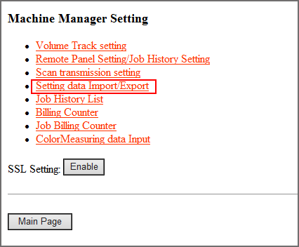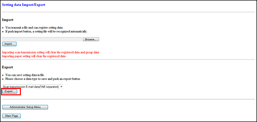 Follow the procedure below to transmit the setting data from the machine to a Computer (export) using the web browser, edit the setting data on the Computer, then return the data to the machine (import).