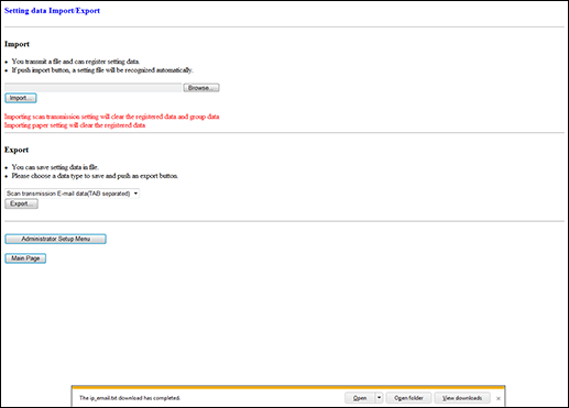 Do not click on [Refresh] on your browser at this time. Click on [Back]. The screen returns to the [Setting data Import/Export] screen.