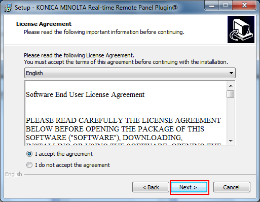 Select [I accept the agreement] after checking the content, and then click [Next].