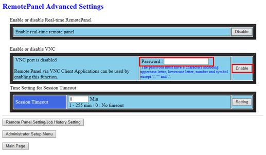 Once the VNC function is enabled or disabled, the setting change cannot be accepted for 10 minutes. To reset the setting, hold steady for 10 minutes or open the [Remote Panel Advanced Settings] screen again after 10 minutes.