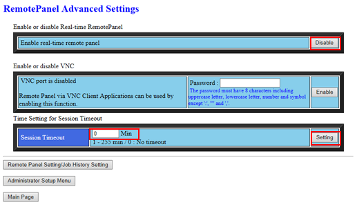 The [Remote Panel Advanced Settings] screen is provided to disable Real-time Remote Panel or to set the time for the session timeout.