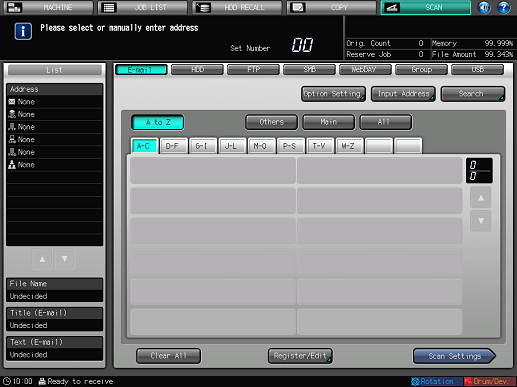 To display this screen, press [SCAN]. Set an address to send scan data.