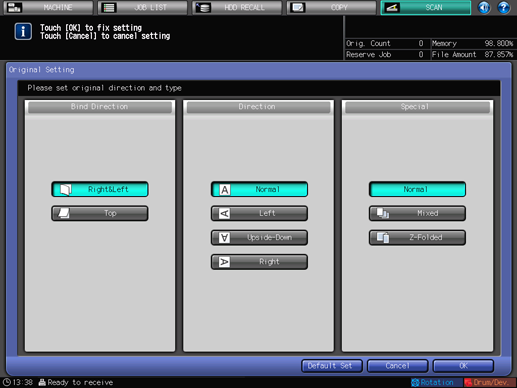 You can set separate scan, bind direction of two-sided original (whether the top and bottom of both sides are the same, or one side is flipped vertically), original orientation, and original type.
