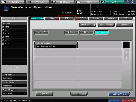 As default, the E-mail address list is displayed. The default destination tab of the [SCAN] screen can be set at Utility/Counter - [User Setting] - [Scan Setting]. For details, refer to Scan Setting: Setting the Default Values for Scan Functions.