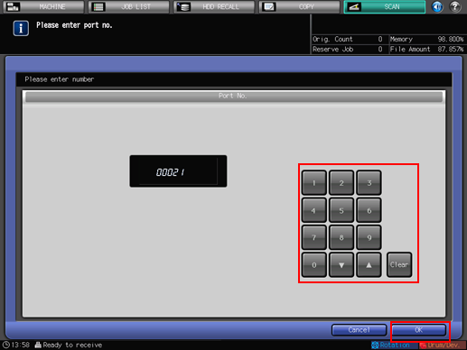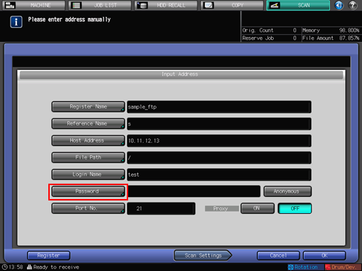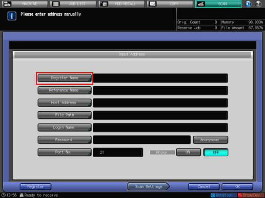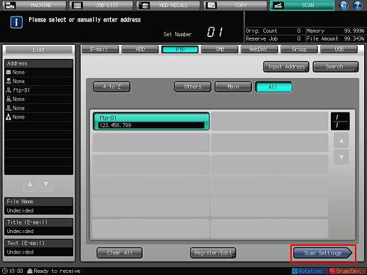 The settings on the Scan Settings screen and the address selected on the [SCAN] screen may remain until the machine is restarted. It is recommended to release the setting and address once the operation is completed.
