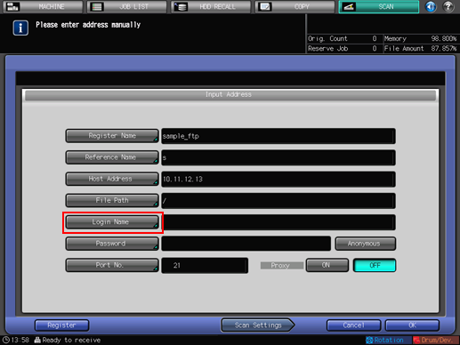 Pressing [Anonymous] inputs "anonymous" in the [Login Name] field. This key is available when you use the Anonymous FTP (where files are shared between unspecified number of users).