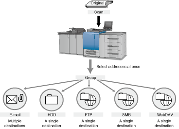 If you register multiple destinations as a group, you can send or save the data scanned from the machine's ADF or the original scanning glass (scan data) to them at one time.