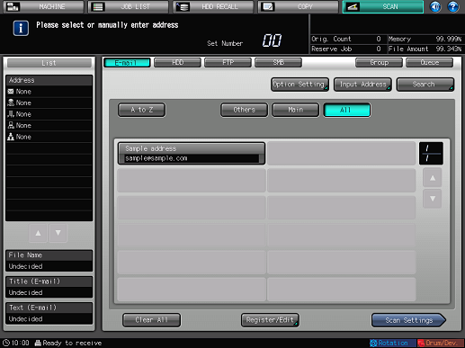 To display this screen, press [SCAN]. Set an address to send scan data.