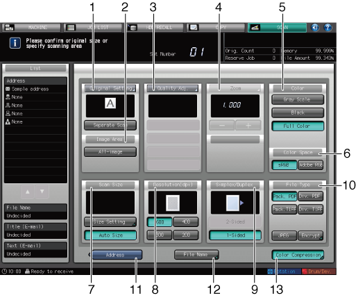 To display this screen, select or input an address, and then press [Scan Settings] on the [SCAN] screen. You can set various settings such as [Original Setting] and [Quality Adjustment].