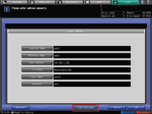 The settings on the Scan Settings screen and the address selected on the [SCAN] screen may remain until the machine is restarted. It is recommended to release the setting and address once the operation is completed.