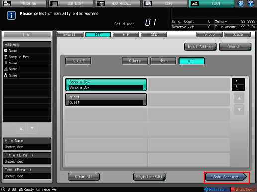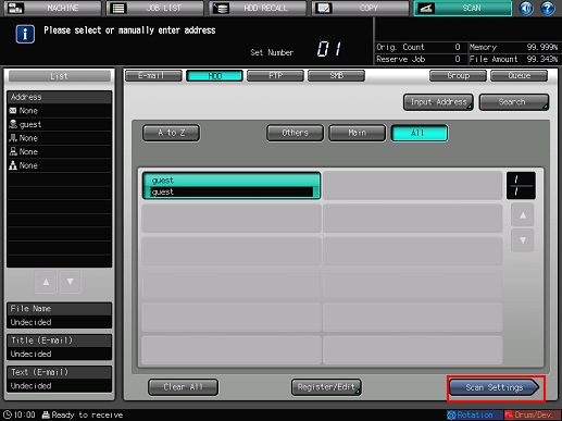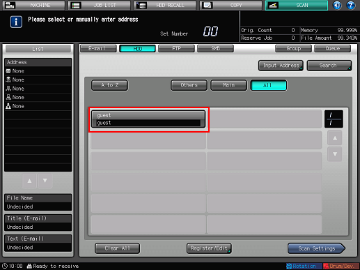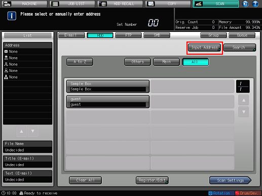 As default, the E-mail address list is displayed. The default destination tab of the [SCAN] screen can be set at Utility/Counter - [User Setting] - [Scan Setting]. For details, refer to Scan Setting: Setting the Default Values for Scan Functions.