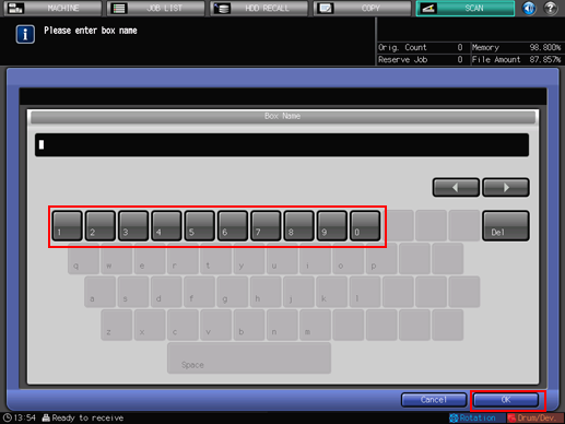 Input the box name that has been registered in the image controller. For details, refer to Registering a User Box as a Destination.