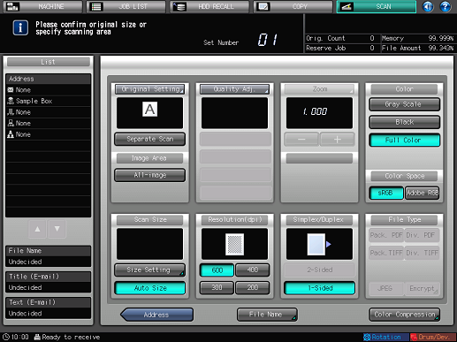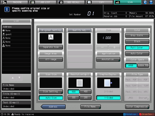 The settings on the Scan Settings screen and the address selected on the [SCAN] screen may remain until the machine is restarted. It is recommended to release the setting and address once the operation is completed.
