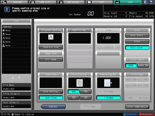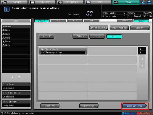 As default, the E-mail address list is displayed. The default destination tab of the [SCAN] screen can be set at Utility/Counter - [User Setting] - [Scan Setting]. For details, refer to Scan Setting: Setting the Default Values for Scan Functions.